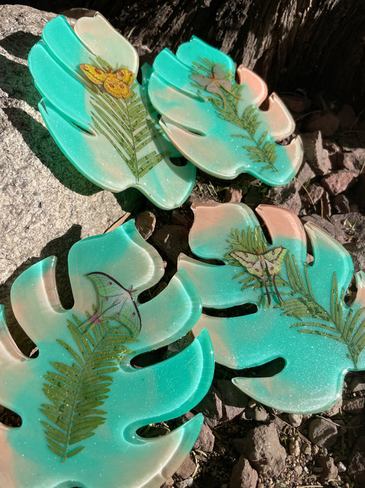 Monstera Aqua Peach Butterfly Coaster Set